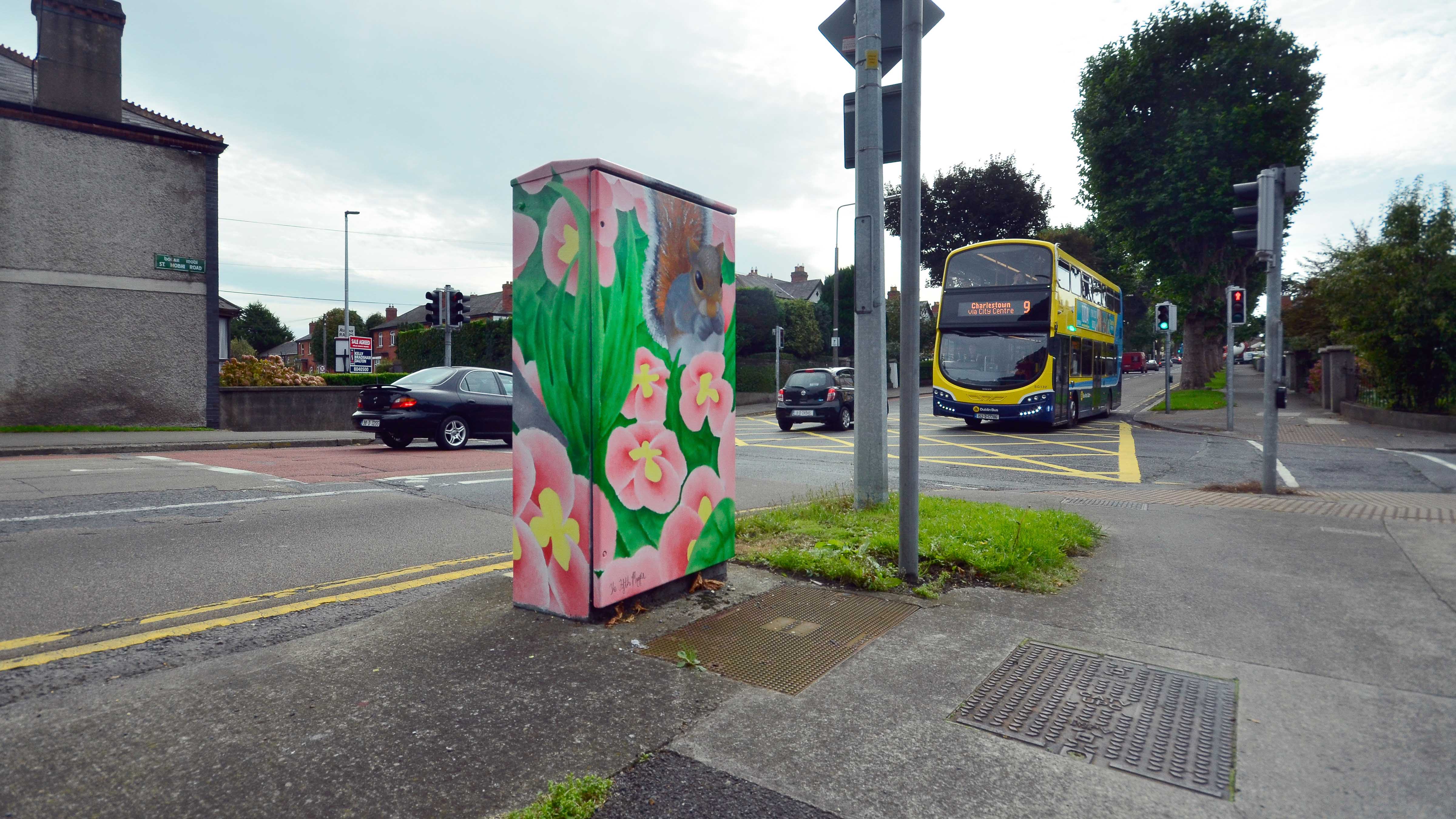 This inquisitive squirrel pokes his head up from a bed of flowers, staring out into the city that surrounds his beautiful home. He is one of the many squirrels that inhabit the Botanic Gardens, a natural niche tucked into an urban setting. "Peeping from the Primulas" looks to highlight this relationship between nature and city life by featuring the flora and fauna of the gardens on a lifeless man-made object.